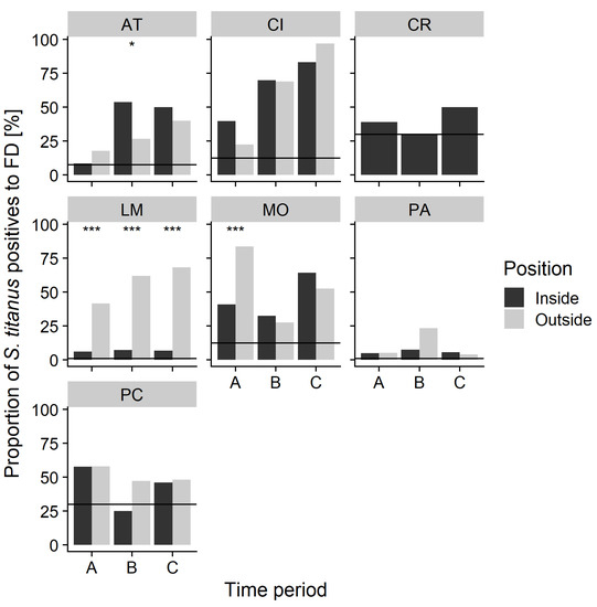 Flavescence dorée phytoplasma infection of S. titanus populations sampled with yellow sticky traps exposed for two weeks inside and outside the different vineyards. Inside and outside levels of infection in the same vineyard are represented. The horizontal black line represents the prevalence of FD-symptomatic grapevines in the vineyard (Table 1). The total number of FDp-tested S. titanus at each vineyard, time point, and trap position is reported in Table S2. Asterisks indicate significant difference between the proportion of FD-infected S. titanus collected inside and outside the vineyard (* p < 0.05; *** p < 0.001).