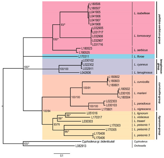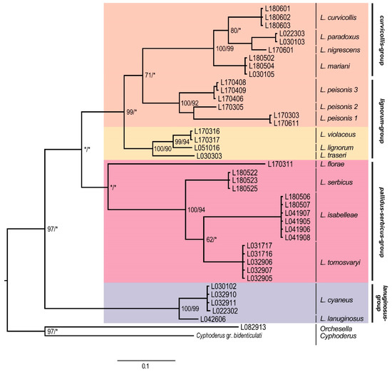 In the COII dataset (Figure 5), the species from the pallidus–serbicus-group were split in two groups. On the one hand, L. arrabonicus and L. florae formed a well-supported clade in the upmost position of the tree, while, on the other hand, L. isabelleae, L. serbicus and L. tomosvaryi formed a well-supported clade located as a sister group of the lanuginosus-group. The curvicollis+lignorum groups formed a clade highly supported by BI. Within this clade, the curvicollis-group appeared as a strongly supported (BI) monophyletic group, while species from the lignorum-group split in several branches. This splitting suggests the presence of cryptic species among the different sampled populations of both L. lignorum and L. peisonis, which is also emphasized by the high mean p-distance and K2P values (14.7 and 16.7 for L. lignorum, and 25.2–26.6 and 31.0–34.0 for L. peisonis, respectively) (Tables S2 and S3).