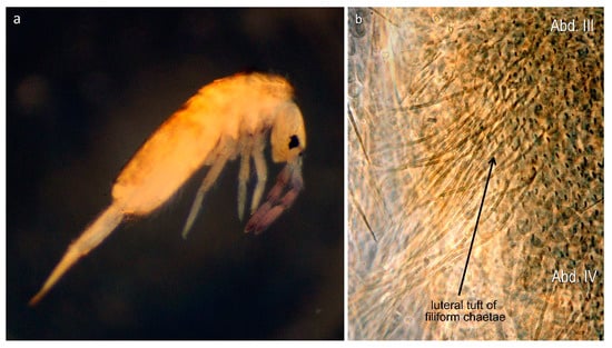 Lepidocyrtus peisonis: (a) Habitus; (b) tuft of filiform chaetae on the lateral part of Abd. III.