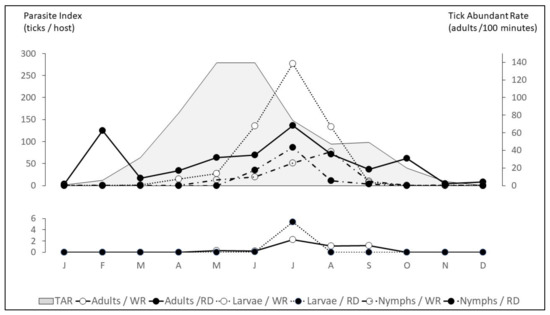 Seasonal pattern of main host infestation by Hyalomma lusitanicum and Tick Abundance Rate (host seeking adults) in a meso-Mediterranean area [32,35,36]. RD = red deer, WR = wild rabbit.