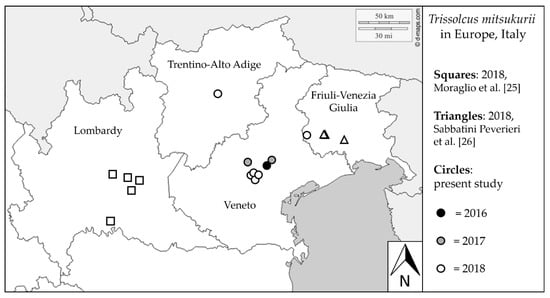 Current distribution of Trissolcus mitsukurii in its non-native area in Europe, northern Italy, with first records separated by year. Adapted from www.d-maps.com. Data from Moraglio et al. [] and Sabbatini Peverieri et al. [] are included.