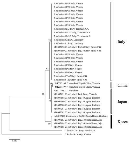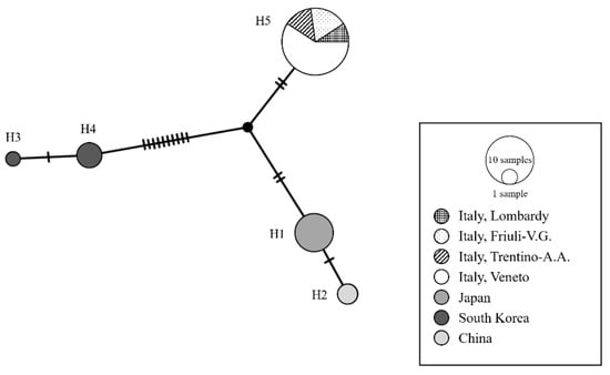 The phylogenetic tree, inferred with sequences of this study and sequences retrieved from GenBank database, distinguished between two highly supported clades. One of them grouped the T. mitsukurii samples from Italy, Japan and China, while the other clade contained specimens from South Korea (Figure 2 and Figure 3). The TCS Network showed the presence of five haplotypes (Figure 2). The haplotype H5 grouped all sequences of this study and five sequences previously obtained from Italy (MK097188, MK097189 and MK097190 in Sabbatini Peverieri et al. [], and two sequences from Lombardy—kindly provided by S.T. Moraglio). The other four haplotypes corresponded to sequences from Asian samples. Two of them, H1 and H2, were separated from H5 by four and five mutational steps, respectively, and included samples from Japan and the Yunnan province of China [,]. The other two haplotypes, H4 and H3, differed from H5 by several mutational steps (12 and 13 respectively) and grouped sequences from South Korea [].