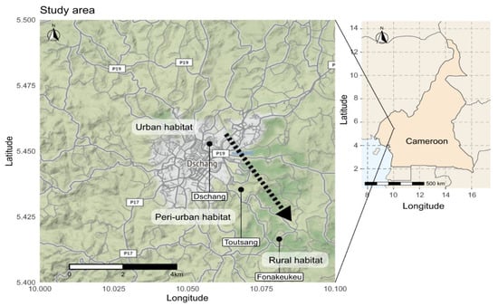 This study was carried out in the Dschang sub-division within the Menoua Division in the West region of Cameroon. Dschang is situated at 1500 m above sea level and is surrounded by many villages. Three types of habitats were selected based on the degree of urbanisation and the following characteristics: number of persons per km2 (human population size), presence/absence of infrastructure and the type of vegetation. The rural and peri-urban habitats were located in Fonakeukeu (05°24′73″ N, 010°04′79″ E), and Toutsang (05°25′65″ N, 010°04′05″ E) villages, respectively, while the urban habitat was located in the town of Dschang (05°16′87″ N, 009°58′42″ E) (Figure 1).