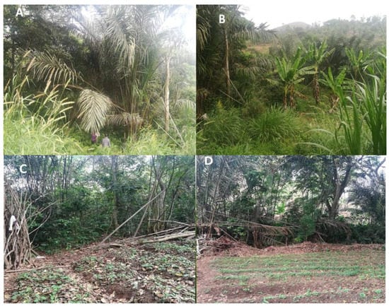 Rural (Fonakeukeu) and peri-urban (Toutsang) sites with raffia palm bushes (A), ‘Toutsang’ surrounded by a banana farm (B) and other cultivated areas in ‘Fonakeukeu’ (C) and ‘Toutsang’ (D).