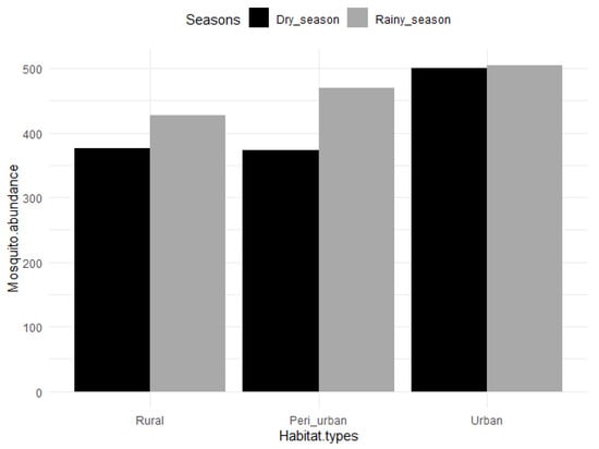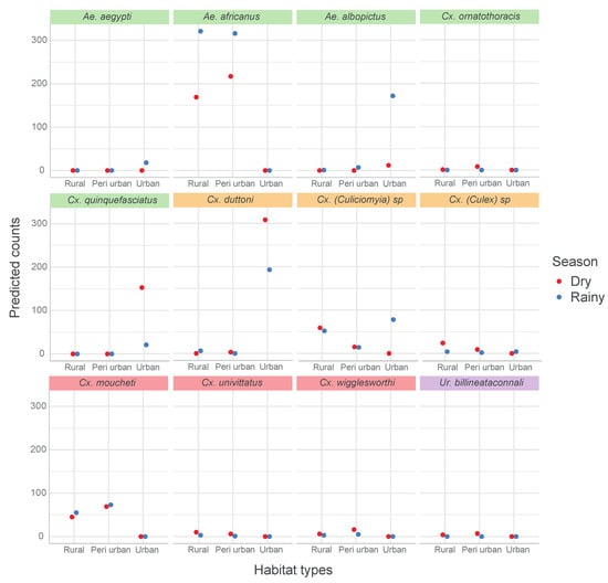 Ae. africanus were only encountered in peri-urban and rural habitats, and mostly during the rainy season, while Cx. pipiens s.l. was only found in urban areas, and in higher quantity in the dry season. On the other hand, Cx. (Culiciomyia) spp., Cx. duttoni and Ae. albopictus were caught in the three habitat types, with significant differences in their abundances in both seasons.