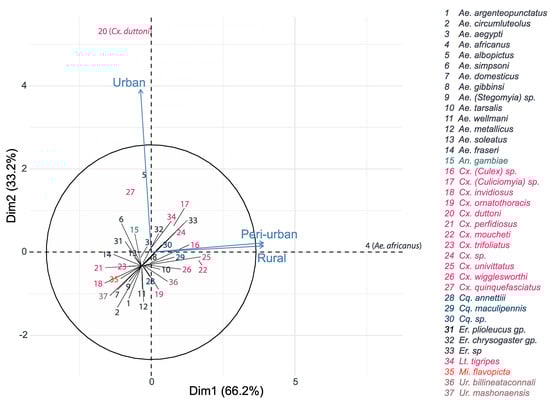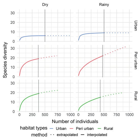 A higher number of mosquito species were found during the rainy season in the urban area (S = 9, 6 for rainy and dry seasons, respectively), and peri-urban area (S = 22, 19 for rainy and dry seasons, respectively), while more mosquito species were captured during the dry season in the rural area (S = 15, 19 for rainy and dry seasons, respectively) (Figure 6).