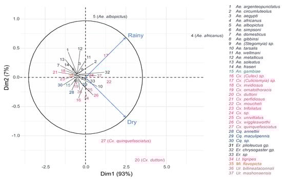 Principal component analysis representing the relationship between mosquito species abundance and seasons.