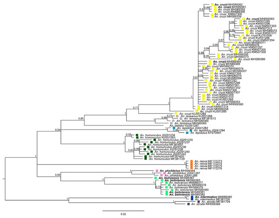 Phylogeny of the Kerteszia species using cytochrome c oxidase I (COI) barcoding region by Bayesian inference tree. Posterior probability values are shown to each clade. Yellow, An. cruzii clade; grey, An. laneanus clade; white, An. bellator; blue, An. lepidotus; dark green, An. homunculus; orange, An. neivai; pink, An. pholidotus; green, An. boliviensis; dark blue, An. (Anopheles) species; dark grey, An. (Nyssorhynchus) species. Specimens reclassified are highlighted in bold (see Table 1 and Table 2).