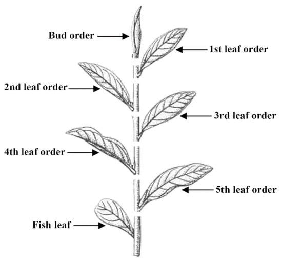 A typical newly growing shoot of the tea plant. The whole shoot was classed as the corresponding leaf order intervals according to the shoot harvesting method.