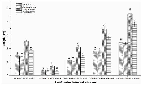 Length of the different leaf order intervals of the tea plant shoot. Bars represent mean ± SE of 30 samples for each cultivar. Bars with the same letters indicate that means comparisons were not significantly different in the same leaf order interval class of the four cultivars (ANOVA, Tukey’s test, p > 0.05). (Original data: Table S1.)