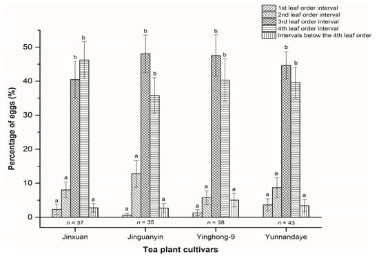 Percentage of Empoasca onukii eggs in the different leaf order intervals of the tea plant shoot. Bars represented mean ± SE of the infested samples (n = 37, 35, 38, and 43 shoots sampled with a total of 172, 128, 111, and 171 eggs for Jinxuan, Jinguanyin, Yinghong-9, and Yunnandaye cultivars, respectively). Bars with the same letters indicate that means comparisons were not significantly different among the leaf order interval classes in a cultivar (ANOVA, Tukey’s test, p > 0.05). (Original data: Table S2.)