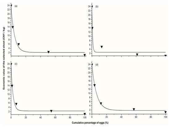 The relationship between the economic value of the selected shoot and the cumulative percentage of eggs of Empoasca onukii within the shoot. The figure shows the exponential model fitting the data for each cultivar: (a) Jinxuan, (b) Jinguanyin, (c) Yinghong-9, and (d) Yunnandaye.