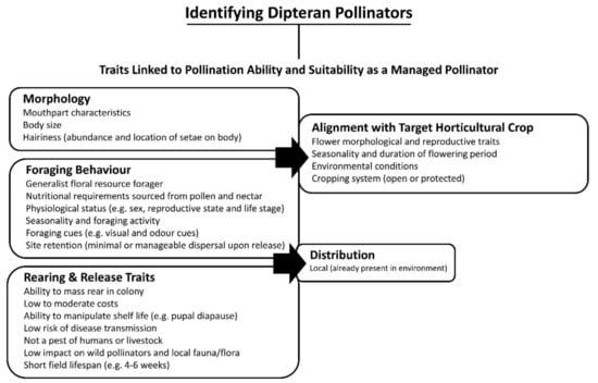 A proposed framework outlining relevant species-specific trait assessment criteria necessary for the identification of potential dipteran pollinators in a horticultural crop setting.