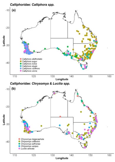 Known distribution of Calliphoridae taxa, (a) genus Calliphora; (b) genus Chrysomya and Lucilia, identified as potential pollinators of horticultural crops in Australia. Records sourced from Atlas of Living Australia [131].