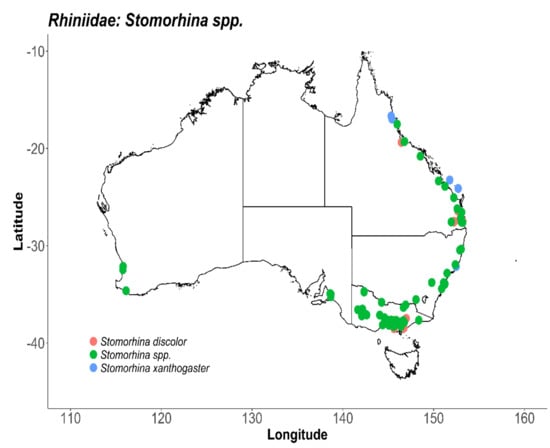 Distribution and morphological data pertaining to the Rhiniidae are available through published surveys, description of species and related taxonomic revisions, but there is a paucity of specific life history and behavioural information particularly in regard to Australian taxa. Representatives of the genus Stomorhina occur across Australia, with many reports only to genus level (Figure 3). Of the two Stomorhina species associated with target crops, S. discolour has an Austo-Oriental distribution and is established along the east coast of Australia [170], while S. xanthogaster has been reported in QLD and NSW (Figure 3). Their foraging behaviour is largely unknown, although in Northern Australian mango crops, S. xanthogaster feeds on pollen, contacting the reproductive structures of the flower in the process [43]. Recent identification of the importance of S. discolour as an unmanaged pollinator of avocado, mango and macadamia crops in Australia highlight the need to further develop basic biological data for the Rhiniidae taxa [37].
