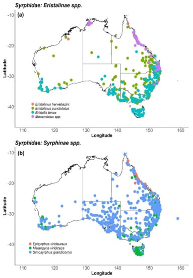 The Australian Syrphidae taxa are relatively species-poor and poorly studied in comparison to Europe and other regions [198]. Revision of the various genera has frequently occurred with multiple names reported in the literature for Australian taxa being preoccupied and subsequently consigned to synonymy. In particular, the taxa of the northern and western regions of Australia are not well known and more endemic species may be described [199].