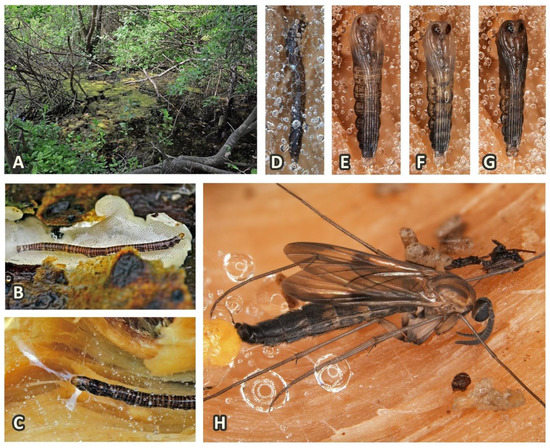 Biology and immature stages of Keroplatidae. This example follows a larva of Cerotelion striatum (Gmelin, 1790) through pupation to hatching. (A) Larval habitat in swampy shrubs of Salix caprea inside a limestone quarry in southern Sweden in early June 2012; (B) Larva feeding on an unidentified wood-growing fungus on a decaying Salix caprea branch partly submerged into water; (C) The larva net-spinning and moving around inside a web on the branch; (D) Pre-pupation took place under a dense web; (E–G) Daily photos of pupal maturing; (H) The adult male hatched only five days after pupation. All photos by J. Kjærandsen.