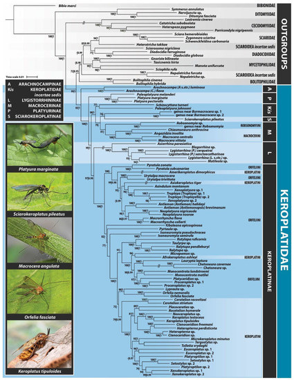 The infraorder Bibionomorpha is one of the largest groups within the Diptera [1], currently including nine extant families plus several unplaced genera (Sciaroidea incertae sedis). With nearly 1000 species described in almost 100 genera, the family Keroplatidae is one of the most diverse families in this infraorder. New species and even genera within the family are continuously being described so the real number of species and genera is supposed to be much higher [2,3,4,5,6]. The family Keroplatidae is currently divided into four subfamilies—Arachnocampinae, Keroplatinae, Macrocerinae, and Sciarokeroplatinae [2,7,8].