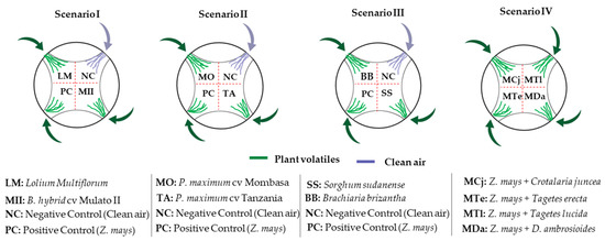 Scenarios considered in attraction (scenarios I, II and III) and repulsion (scenario IV) bioassays of third instar (L3) larvae of S. frugiperda in the presence of potential attractant or repellent plants in a 4-way olfactometer.