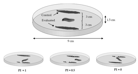 The feeding preference of S. frugiperda larvae was studied through two-choice tests carried out by placing leaves of 3 cm2 (3 cm × 1 cm, obtained 30 min before from 30-day plants) in Petri dishes (9 cm diameter and 1.5 cm height) floored with a filter paper discs and a small cotton ball by the edge of the Petri dish (Figure 2). Filter paper discs and cotton balls were moistened with distilled water. The leaves were previously washed with water and dried at room temperature 15 min prior to experimentation. A first instar (L1) larva of S. frugiperda was placed in the center of each petri dish, equidistant to the leaves. We used 30 larvae in each of the six Z. mays–grass comparisons. Larval responses were recorded after 12 h (8 p.m. to 8 a.m.) and feeding preference was analyzed with the preference index (PI) used by Martínez et al. [40].