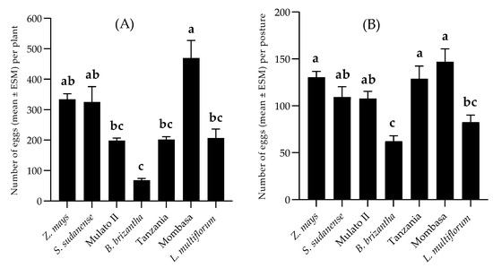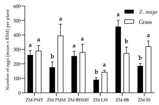 Number of eggs (Mean ± SEM) oviposited per plant by S. frugiperda in two-choice test. Different letters indicate the existence of significant difference in the t-test (p < 0.05). ZM = Z. mays; PMT = P. maximum cv. Tanzania; PMM = P. maximum cv. Mombasa; BHMII = B. hybrid cv. Mulato II; LM = L. multiflorum; BB = B. brizantha and SS = S. sudanense.