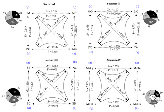 Behavioral responses of attraction (Scenarios I, II and III) and repulsion (scenario IV) of S. frugiperda larvae (L3) in presence of potential attractive [LM = L. multiflorum, MII = B. hybrid cv. Mulato II, MO = P. maximum cv. Mombasa, TA = P. maximum cv. Tanzania, SS = S. sudanense, BB = B. brizantha, NC = Negative Control, PC = Positive Control (Z. mays)] or repellent plants [M + Cj = Z. mays + C. juncea; M + Te = Z. mays + T. erecta; M + Tl = Z. mays + T. lucida; M + Da = Z. mays + D. ambrosioides]. Z = Wilcoxon signed-rank test preceded by Friedman test (α = 0.05). For each scenario, different letters at the corners indicate significant difference (Wilcoxon signed-rank test, α = 0.05). Pie graphs besides each scenario represent the number of larvae responding to each condition. The circle in the middle of the scenario IV pie graph represents the number of larvae that made no choice.