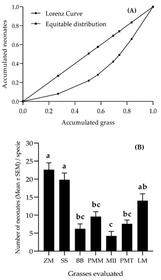 A Gini index of 0.318 was considered average according to Noce et al. [47], and the distance of the Lorenz curve from the equidistribution line indicates the concentration of neonates in some of the grasses (Figure 6A). Most of the neonates concentrated on maize (27.06%), S. sudanense (23.53%) and L. multiflorum (16.47%) (Figure 6B).