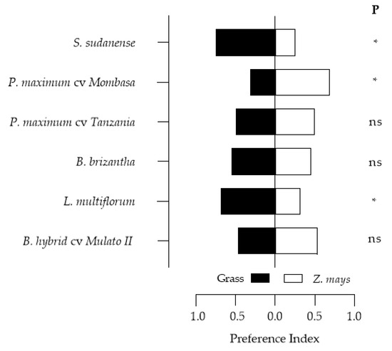 Feeding preference indices of S. frugiperda larvae in two-choice tests. * p < 0.05 (significant difference), ns = no significant difference.