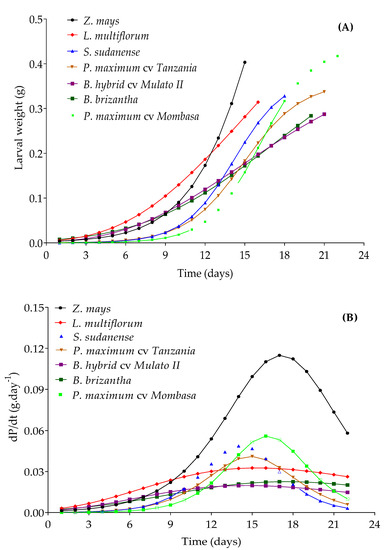 Growth curve (A) and growth rate (B) for S. frugiperda larvae weight in different grasses. Curves were compared at day 15. dP/dt = derivative of the weight growth function with respect to time, which represents larval weight growth rate.