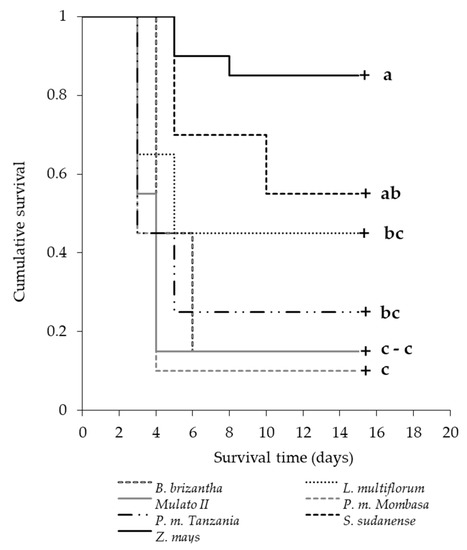 The probabilities of survival of the neonates were higher in Z. mays, S. sudanense and L. multiflorum, respectively (Wilcoxon test; ) (Figure 9), where the first two had survival times over 7 days. P. maximum cv. Tanzania, B. brizantha, B. hybrid cv. Mulato II and P. maximum cv. Mombasa presented survival times below 5 days, and survivals rates below 0.25.
