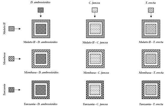 The combination of the trap plants (B. hybrid cv. Mulato II, P. maximum cv. Mombasa and P. maximum cv. Tanzania) with the three species repellent to S. frugiperda (D. ambrosioides, T. erecta and C. juncea) generated nine push–pull strategies (Figure 10).
