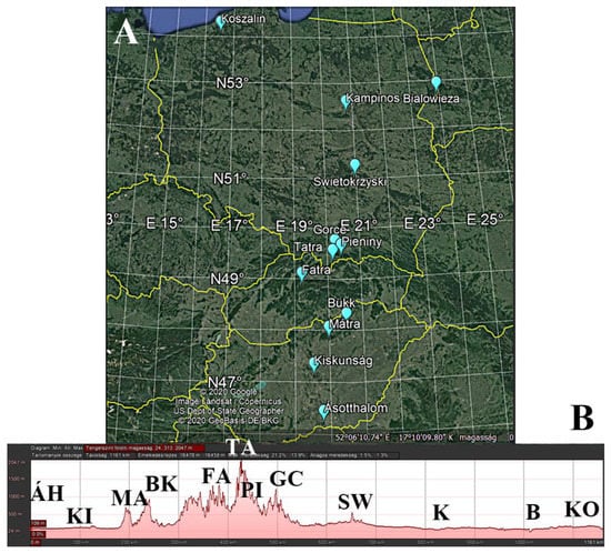 Study regions along the latitudinal (A) and altitudinal (B) gradient in Central Europe (Hungary, Slovakia, and Poland). Abbreviations: Hungarian lowland: ÁH = Ásotthalom, KI = Kiskunság; Southern Carpathian foothill: MA = Mátra; higher Carpathians (mountain range): BK = Bükk, FA = Fatra, TA = Tatra, PI = Pieniny; Northern Carpathian foothill: GC = Gorce; Polish lowland: SW = Świętokrzyska, K = Kampinos, B = Białowieza, KO = Koszalin.