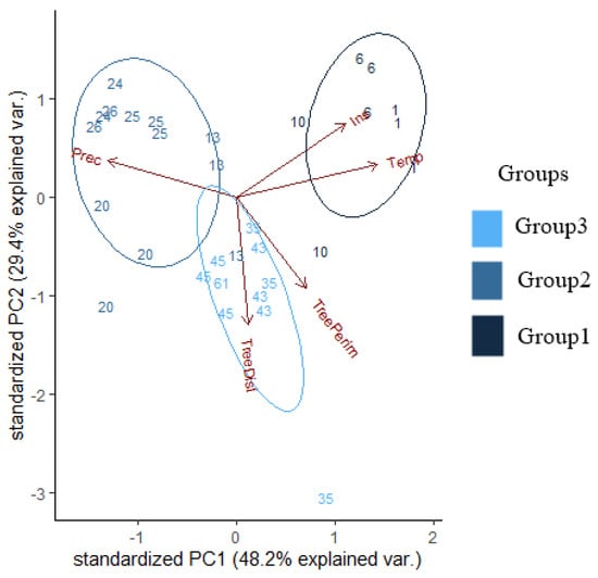 Visual representation of the principal component analyses (PCA) and the three groups (Group1 = Hungarian lowland regions, including the Southern Carpathian foothill (Mátra); Group2 = higher Carpathian Mountainous regions, including the Northern Carpathian foothill (Gorce); Group3 = Polish lowland regions) based on the background variables. Prec = average yearly precipitation, Ins = average yearly irradiation, Temp = average yearly temperature, TreeDist = distance of the closest trees, TreePerim = perimeter of the closest trees.
