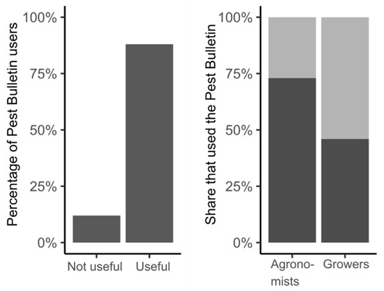 There is a lack of published evidence of the benefits provided by the use of decision support tools in terms of reduced and/or better-targeted interventions for the management of the pest insects considered in this review. These benefits would ideally be expressed in some relevant currency such as financial savings or environmental risk reduction. Studies have been undertaken for some other pests of field crops and, for example, Ferguson et al. [99] go some way towards this in the context of the management of Meligethes spp. on oilseed rape, making a comparison between simple rule-based advice and a phenological-model-based decision support system. For the species considered in this review, a questionnaire survey conducted by the Agriculture and Horticulture Development Board (AHDB) established the broad range of uses of pest monitoring and forecasting information disseminated to vegetable growers in Britain through the AHDB Pest Bulletin (including information on D. radicum, D. platura, D. florilega and C. rosae) and an estimate of ‘use’ and ‘value’ [100]. The vast majority (88%) of Pest Bulletin users rated it as either very useful or quite useful, and use was higher amongst agronomists than growers (73% versus 46%) (Figure 3). Of the options provided in the questionnaire, users indicated that targeting in-field monitoring was the most common way the Pest Bulletin supported decision making, followed by targeting of insecticide sprays and determining spray frequency. Selection of plant protection products was the least common response. Other uses for the information included: supporting their own field observations, comparing numbers to previous years, collecting data for personal interest, and to keep informed/ahead of emerging issues. Just 12% of users felt that the Pest Bulletin did not support their decision making. This questionnaire was disseminated primarily to ensure that there was sufficient interest in the AHDB Pest Bulletin for the AHDB to continue to fund it and it in no way tried to assess the ‘true’ value of the information provided. Going forward, an evidence-based estimation of the economic and environmental paybacks could promote the acceptance, and thus greater use, of decision support tools by growers, as well as supporting the development of additional phenological models for established and newly-occurring pest species.