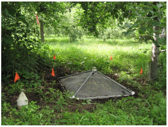 The field experiment took place at the University of Massachusetts Cold Spring Orchard (Belchertown, MA, USA) from 24 July to 30 August, 2019. In early July 2019, we collected infested apple fruitlets presumably infested with C. nenuphar from unmanaged trees in the Belchertown area. Upon collection, the fruit was mixed and stored at ambient temperature for about 10 days, to allow C. nenuphar larvae to continue developing. On 24 July, the fruit was transported to an unsprayed section of the orchard. Seventy-five fruit were placed underneath the canopies of each of 20 apple trees, within a 1 m2 area. EPNs were applied at a rate of 200 IJ/cm2 using 3.78 L of water, and the same amount of water alone was applied to the control. After treatment application, the emergence cages were placed on the ground, covering the fruit, and the edges of the cages were buried in the soil to ensure the emerged adults would not escape. Pieces of apple were placed inside the emergence cone as an attractant as soon as the first adult C. nenuphar was captured in the topping device. Each of the treatments (three nematode species) and the control were replicated five times. No additional water (except for natural precipitation) was added to the cages.