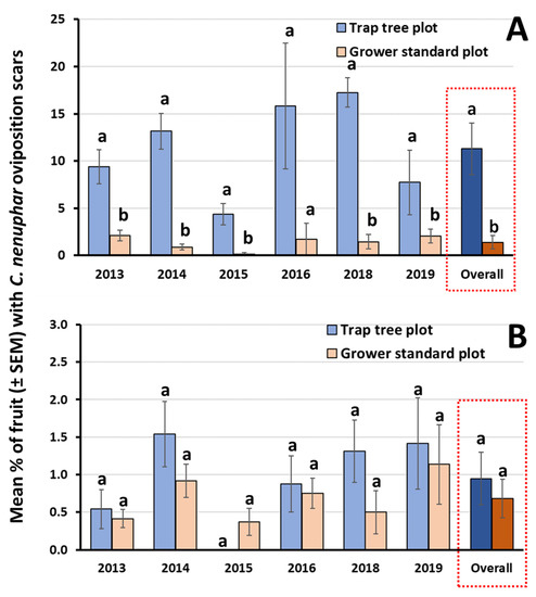 For each year and across all six years, level of fruit injury caused by C. nenuphar to (A) trap trees in trap tree plots and control (unbaited) trees in grower standard plots, and (B) interior trees, the strongest measure of treatment performance, comparing the two treatment regimes. Means within a panel and for each pair of bars capped with different letters are significantly different (t-tests: p < 0.05).