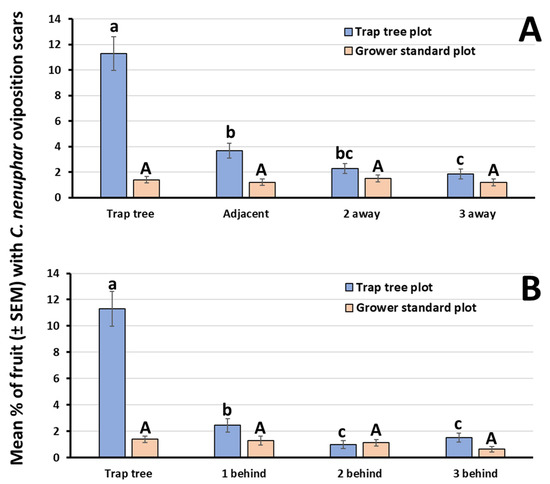 For the quantification of potential spillover effect, level of fruit injury caused by C. nenuphar to (A) odor-baited trap trees in trap tree plots, control (unbaited) trees in grower standard plots, and peripherally located neighboring trees; and (B) odor-baited trap trees in trap tree plots, control (unbaited) trees in grower standard plots, and to trees located behind (i.e., in interior rows). Within a panel and for each treatment, bars capped with different letters are significantly different (analysis of variance (ANOVA) p < 0.05).