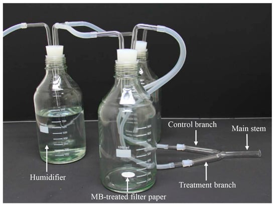 A Y-tube olfactometer, similar to that described by Rahman and Lim [36], was used to analyze the olfactory response of N. tenuis to MB. The olfactometer consisted of a Y-shaped glass tube with an inner diameter of 3 cm; the tube had 15-cm-long arms and a 12-cm-long main stem. The angle between the two arms was 45°, whereas the angle between the arm and the main body was 155° (Figure 1). A glass bottle (1 L) with a glass tube (0.9 cm diameter), a Teflon PTEF tube (0.9 cm inner diameter and 1 cm outer diameter), and a cylindrical rubber cork with a hole were connected to each of the arms. A piece of Whatman® filter study was treated with 20 µL of a given MB solution (one of 0.25%, 0.5% or 1% MB), air-dried for 3 min and then introduced into one of the two bottles. The second bottle contained the negative control, which did not contain MB, but instead had filter study with the same volume of distilled water only. Each of these two bottles was also connected by tubes to a third glass bottle filled with distilled water to humidify the flow of compressed artificial air through the test system; this created an air stream of 400 mL/min/arm.