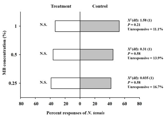 Overall, in the olfactory experiment, ~80% of the adults of N. tenuis made a choice to approach the MB concentration or negative control within the maximum time allowed (10 min). MB concentrations appeared to be somewhat repellent to N. tenuis, but there were no significant differences between their repellency and that of the control (Figure 2). Specifically, in the 1% MB test, 33.3% of the predatory bugs chose the 1% MB treatment branch, whereas 52.8% chose the control branch (χ2 = 1.58, df = 1, P = 0.21). In the other two respective olfactory tests, 36.1% of N. tenuis chose the 0.5% MB treatment branch, while 44.4% chose the control branch (χ2 = 0.31, df = 1, P = 0.58). On the other hand, 38.9% chose the 0.25% MB treatment branch, where 41.7% chose the control branch (χ2 = 0.035, df = 1, P = 0.85) (Figure 2).