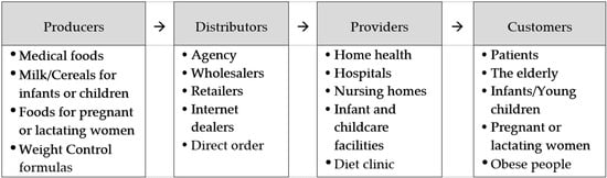 Medical foods are classified as ‘foods for special dietary uses’ in Korea [15]. Foods for special dietary uses can be defined as food created for specific targets that require special nutritional management, such as infants/young children, patients, the elderly, the obese, or pregnant/lactating women. The industrial value chain of the food category is shown in Figure 1. Food producers distribute products through distributors, and distributors deliver products to customers through providers. Because of the nature of the product, some medical foods are delivered to consumers through hospitals or nursing homes. In the health care field where ‘information asymmetry’ is present [16], doctors and nurses who have more information and indirect experiences than patients have an important role in the industrial value chain of the foods.