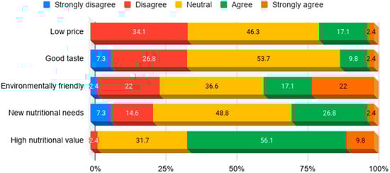 The results of surveying participants’ attitudes toward new products on the market, showed that 46.7% of the respondents did not like trying new food products, 24.4% did, and 28.9% had a neutral attitude. These results show that healthcare professionals and caregivers have a rather conservative approach to food. Wilkinson et al. [53] confirmed that the reluctance to eat new foods and previous experience of consuming insects affect entomophagy.
