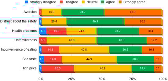 The reasons for not purchasing insect medical foods were also investigated. As is shown in Figure 3, the main causes were that participants were either disgusted by insects (strongly agree 46.9%, agree 34.7%) or overwhelmingly concerned about the safety of insects as raw materials (strongly agree 30.6%, agree 46.9%). Additionally, there were some concerns about health problems (strongly agree 18.4%, agree 34.7%). The results of the survey showed that the overall disgust and distrust of insects as raw materials were the biggest obstacles hindering the consumption of edible insects. Therefore, starting an insect medical food business could be difficult if the aversion to insects is not inversed and their safety as raw materials is not established.