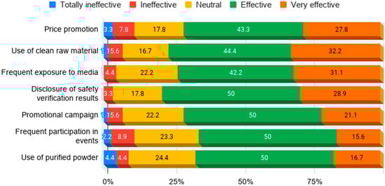 When participants who had no intention of providing insect medical foods to patients were asked what measures would be effective in promoting the consumption of said foods, many answered that using clean raw materials, price promotions, and frequent media exposure would be effective measures (Figure 4). Many participants evaluated these strategies to be effective in increasing the attractiveness of insect medical foods.