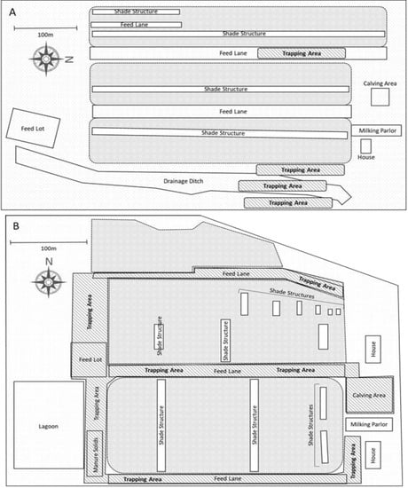 Diagrammatic sketches of the dairies and sites sampled. Cattle are held in separate pens collectively indicated by areas with solid grey shading. (A) BS Dairy: Three traps were placed into each of 4 trapping areas (dark grey diagonal striped area) ranging from just west of the dairy center to the eastern edge of the dairy (12 traps per day). (B) OS dairy: Twelve traps were placed randomly each day within the trapping area (dark grey diagonal striped area), at locations where facility workers and cattle would not interfere with them.