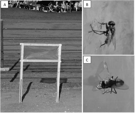 Flight activity was recorded hourly starting from 30 min before civil dawn (ranging from 05:50–07:07 over the course of the study) through civil dusk (19:00–21:00) using 12 sticky panel traps consisting of a wooden frame (30.5 cm tall × 70 cm wide) with a clear plastic sticky sheet (Olson Products, Medina, OH, USA, Part# B005BCST8M) attached to both the front and back of the frame (Figure 2A). The top of each trap was positioned 1 m above ground and there was a minimum of 10 m separation among traps. House flies were observed to both land on (Figure 2B) and directly fly into these clear sticky sheets (Figure 2C), an indication that flies did not always perceive the clear sticky sheets as a barrier. At the BS dairy, traps were grouped into four trapping areas which were selected to avoid impacting normal dairy operations and to sample a variety of areas ranging from west of the dairy center to the eastern edge of the dairy. All traps were positioned with the sticky faces oriented east and west. Trap locations remained in the same positions over all trapping days at the BS dairy. At the OS dairy, trap placement and trap face orientation by cardinal direction was randomly selected each study day. The layout of this dairy allowed for more flexibility in trap placement than at the BS dairy.
