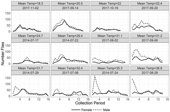Total female (solid) and male (dotted) house flies collected during each collection period on each date. Panels are arranged from lowest (top left) to highest (bottom right) mean daytime temperature.