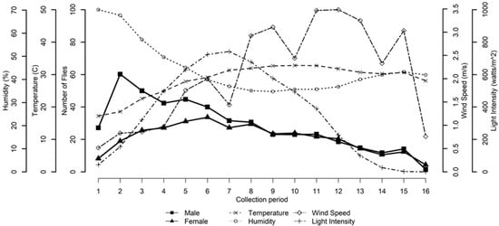 At Dawn, flight activity for both sexes was positively associated with light intensity and temperature, while unrelated to both wind speed and humidity. During Midday, flight activity for both sexes was positively associated with light intensity but negatively associated with temperature, while unrelated to wind speed and humidity. At Dusk, flight activity for both sexes was positively associated with temperature and wind speed, while unrelated to light intensity or humidity.