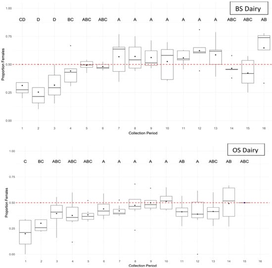 Proportion of house flies captured on sticky traps that were female during each collection period at the BS Dairy and OS Dairy. Black diamonds indicate raw mean proportions. Sex ratio was not significantly different after Tukey’s correction of the p-value (α = 0.05) for collection periods with the same letter.