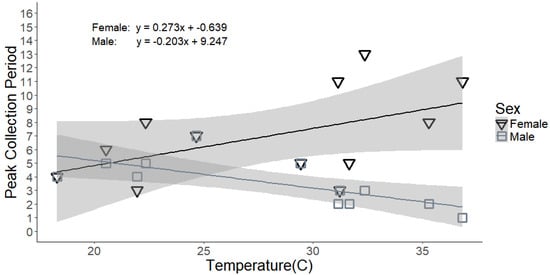 Collection period with peak house fly flight activity by mean daytime temperature for male (grey; squares) and female (black; triangles) house flies. Shaded bands around each line indicate the 95% C.I. by fly sex.