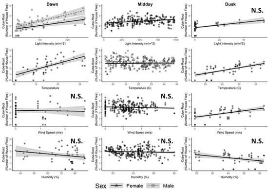 Predictors of house fly activity near Dawn, through Midday, and near Dusk. Each panel shows the relationship of house fly activity with measured environmental variables: light intensity, temperature, wind speed, and humidity. For environmental variables to which the fly sexes responded similarly, data are combined into single regression line with data points indicated as grey circles. When significant differences by sex were observed for an environmental variable, the data are separated for males (dashed lines; squares) and females (solid line; triangles). Light grey bands around each line indicate the 95% C.I. for each fitted regression line. Non-significant environmental factors are indicated by N.S.